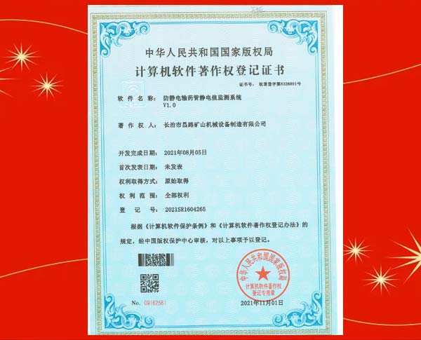榮獲防靜電輸藥管靜電值監(jiān)測(cè)系統(tǒng)著作權(quán)登記證書
