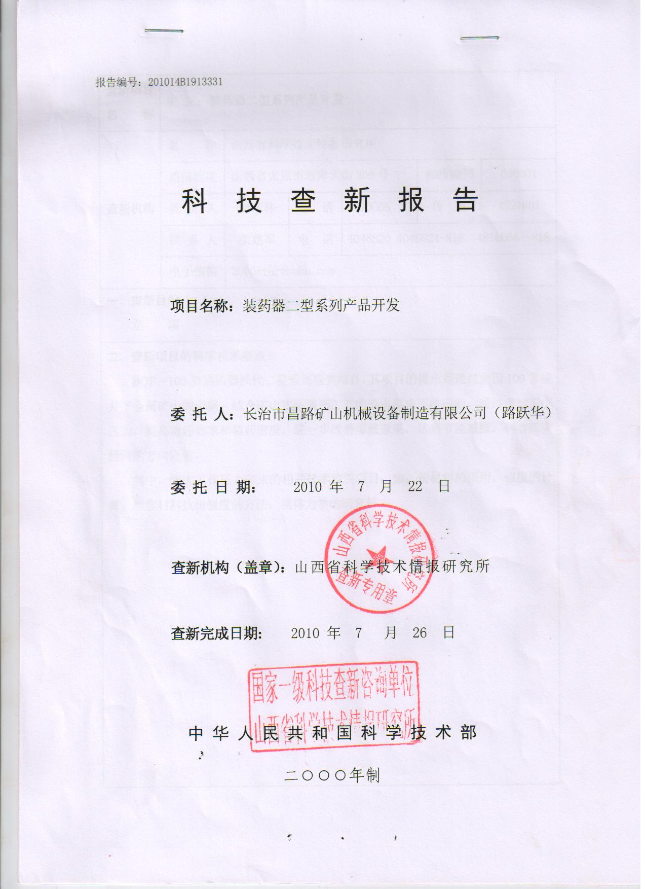 裝藥器二型開(kāi)發(fā)科技查詢報(bào)告 國(guó)家一級(jí)科技單位